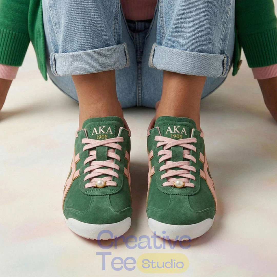 Step into sisterhood with unmatched vibrance in the Alpha Kappa Alpha Premium Tiger Shoes (Green Edition). Dressed in the sorority’s signature apple green with salmon pink accents, these sneakers are designed for the woman of substance who leads with grace and serves with pride. Featuring a classic “Tiger” silhouette and high-end pearl-inspired detailing, these shoes are a bold tribute to the first intercollegiate Greek-letter sorority for African American women.