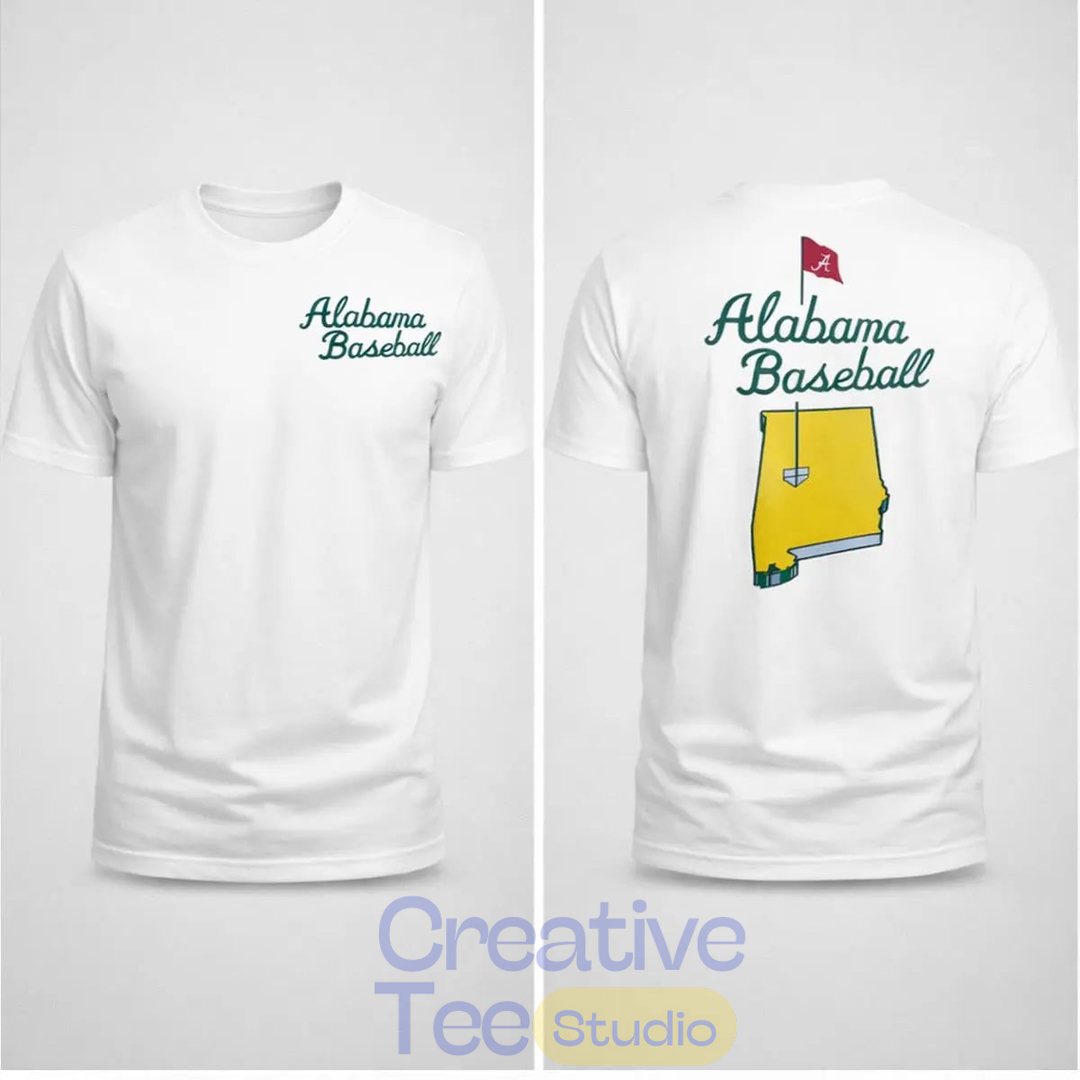 This classic white tee features a sharp, vintage-inspired design: “Alabama Baseball” scripted in elegant green across the left chest on the front, while the back showcases a bold yellow outline of the state of Alabama with the iconic “A” flag flying high.