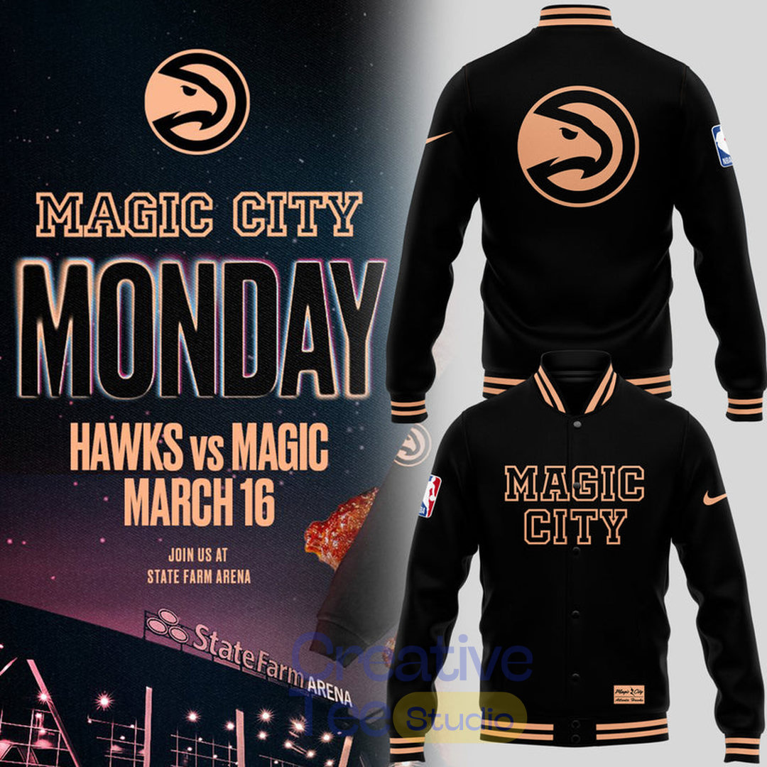 Elevate your Hawks fandom with the Atlanta Hawks 2026 Magic City “True To Atlanta” Special Baseball Jacket. This sleek black bomber features the iconic Hawks logo on the back, bold “MAGIC CITY MONDAY” graphics, vibrant orange accents, and “JOIN US MARCH 16 STATE FARM ARENA” detailing. Crafted for comfort and street-ready style, it celebrates Atlanta’s unapologetic vibe and the memorable March 16 showdown vs. the Magic. True to the city, true to the team. Limited edition spirit in every stitch.