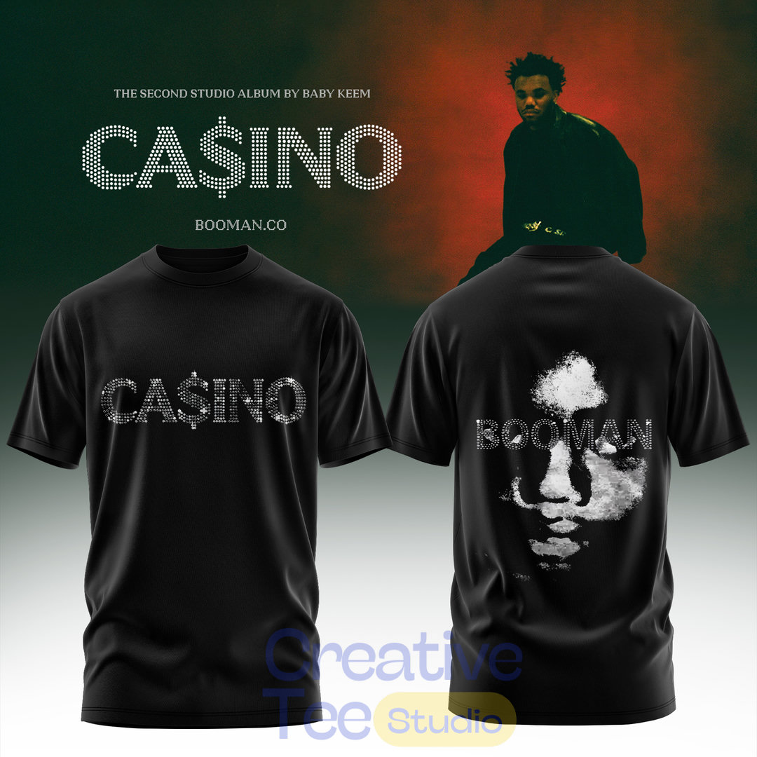 - Black Version: Delivers a clean, minimalist look with “CA$INO” in sparkling dot font on the front and a powerful high-contrast portrait of Keem on the back with “BOOMAN” branding.