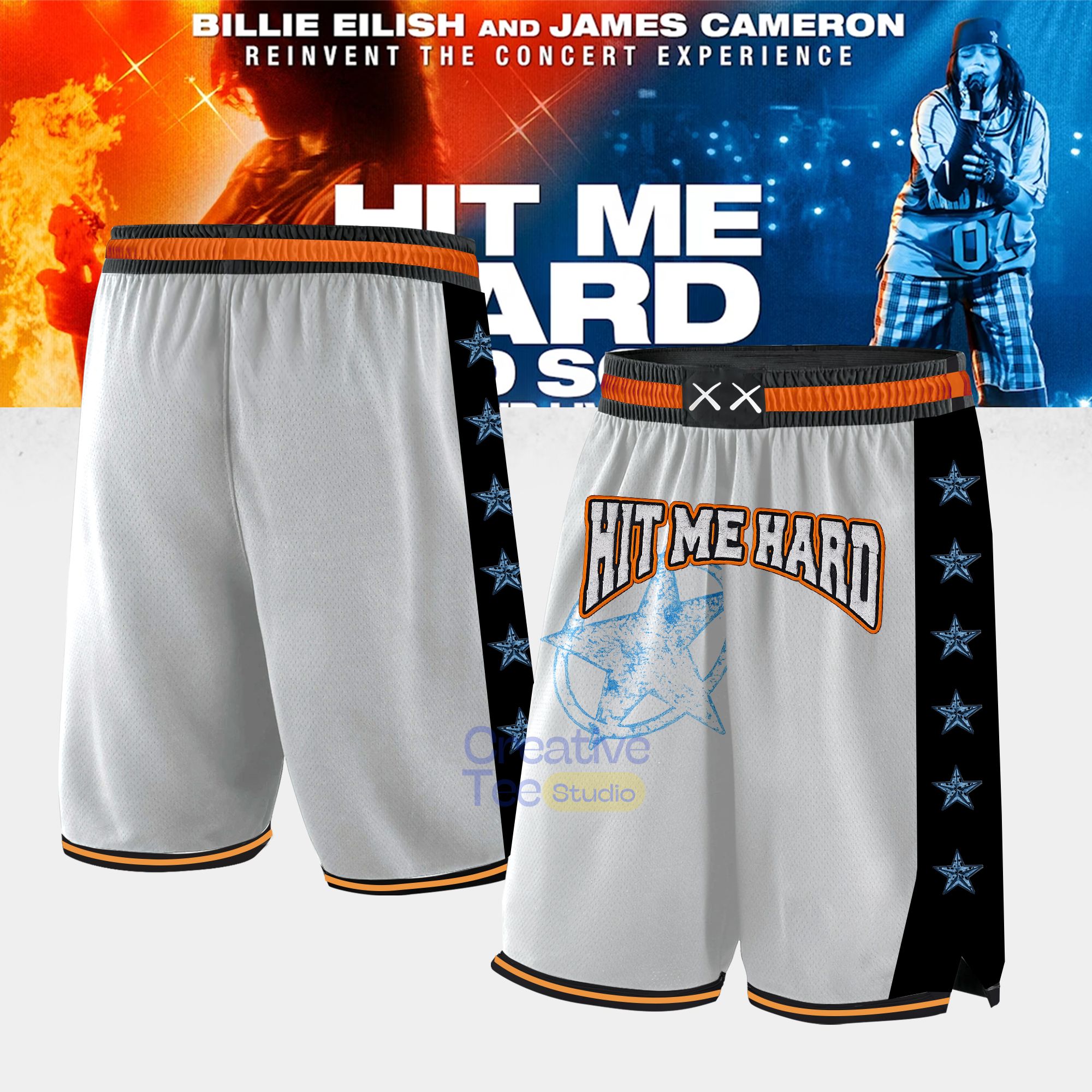This special edition basketball jersey is a tribute to the visual world of Billie Eilish’s 2026 tour. The front features a bold, multi-colored “Hit Me Hard” graphic, anchored by a stylized portrait of Billie and vintage-inspired star motifs. The back continues the narrative with the iconic “Blohsh” figure rendered in a camouflage texture, paired with Billie’s distinctive signature. This piece is designed to mirror the energy of her live performances—unapologetic, vibrant, and deeply personal.
