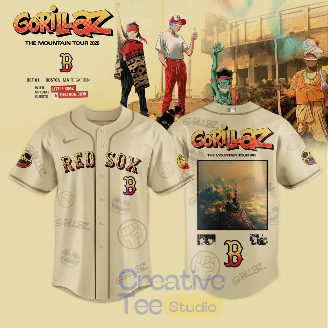 Celebrate the ultimate crossover between Boston sports legacy and Gorillaz’s virtual world with this exclusive Boston Red Sox x Gorillaz ‘The Mountain Tour 2026’ Baseball Jersey. Featuring the classic cream Red Sox base with bold “RED SOX” and “B” lettering on the front, this limited-edition piece fuses MLB heritage with the band’s iconic style. The back showcases a striking graphic from Gorillaz’s The Mountain era, paired with vibrant tour-inspired details on the sleeves—including character motifs and psychedelic accents. Perfect for Fenway faithful, Gorillaz fans hitting the 2026 tour, or anyone craving bold streetwear that bridges baseball and alternative music culture. Breathable, full-button design—wear it to the game, the concert, or everywhere in between.