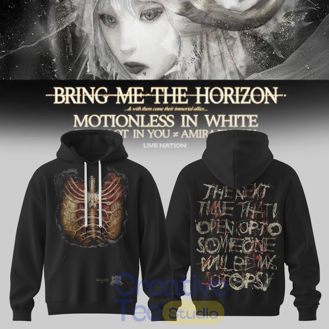 This heavy black hoodie features a detailed white graphic on the front with intricate BMTH artwork and the Ascension Program emblem. The back showcases a haunting image paired with powerful lyrics from “Motionless In White” and “It In You = Ambition”.