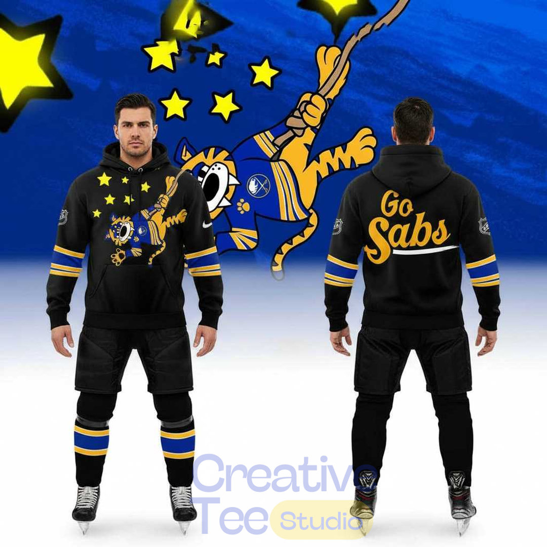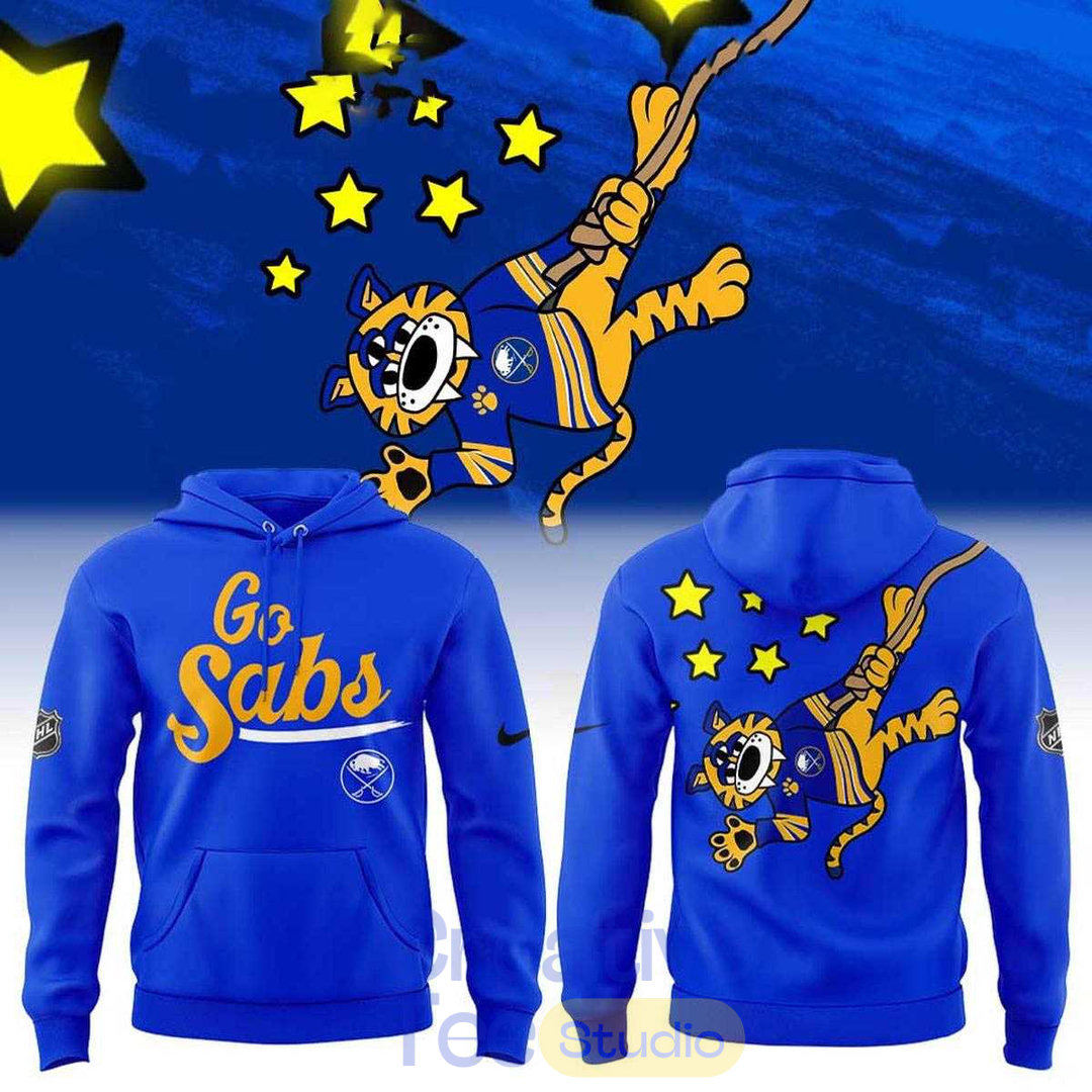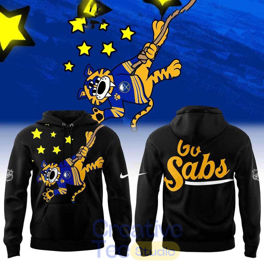 The front showcases “Go Sabs” in stylish gold script lettering above the Buffalo Sabres crest. On the back, the design explodes with personality: Sabretooth is captured mid-air in a dynamic, playful pose, swinging from a hockey stick while surrounded by a shower of bright gold stars against a deep blue background — perfectly representing the “Go Sabs!” spirit that fills KeyBank Center on game nights.