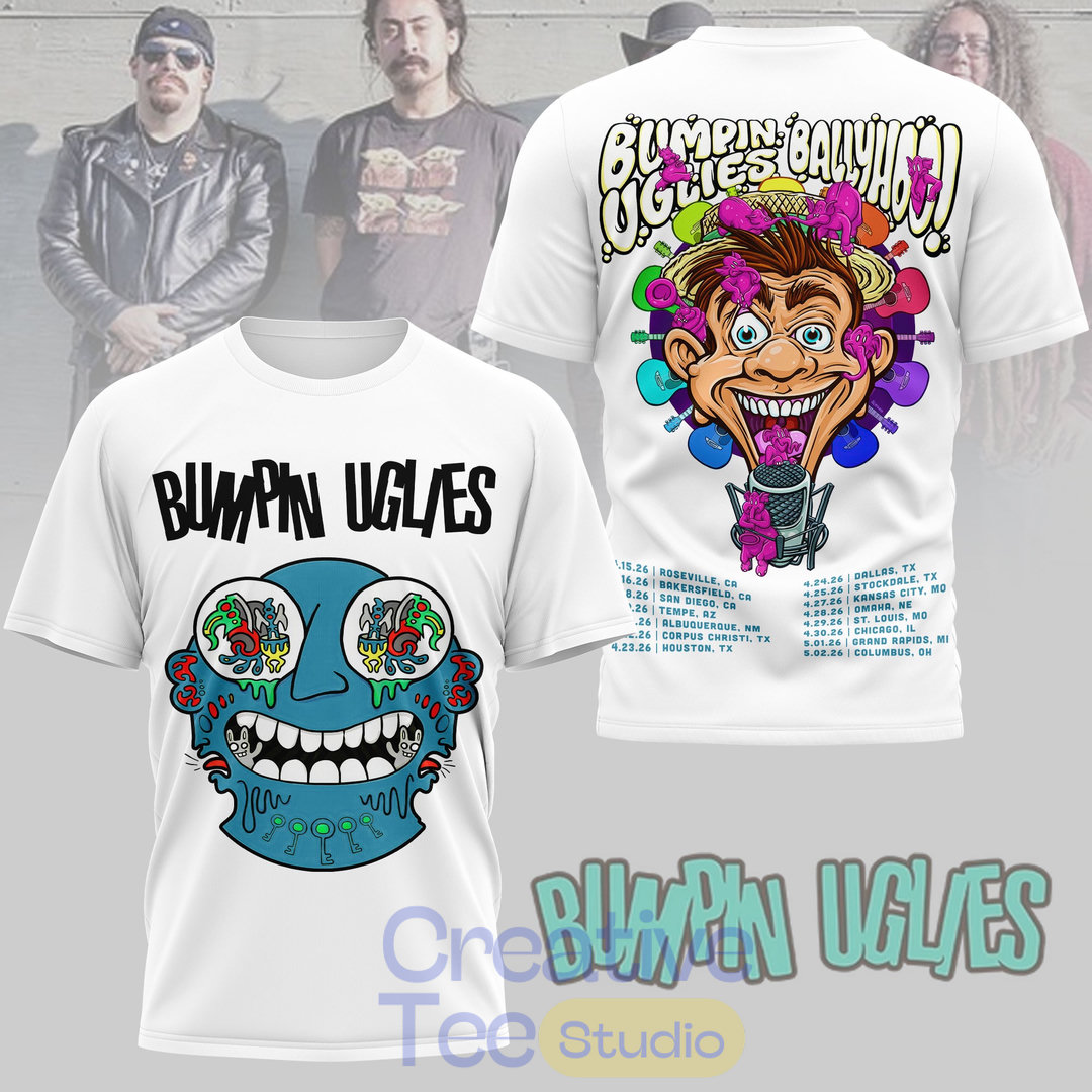 The front features a wild, grinning turquoise skull with bulging eyeballs and the band name “BUMPIN UGLIES” in bold black lettering. The back delivers full tour energy with a colorful cartoon character, “BUMPIN UGLIES 2026”, and the complete list of tour dates.