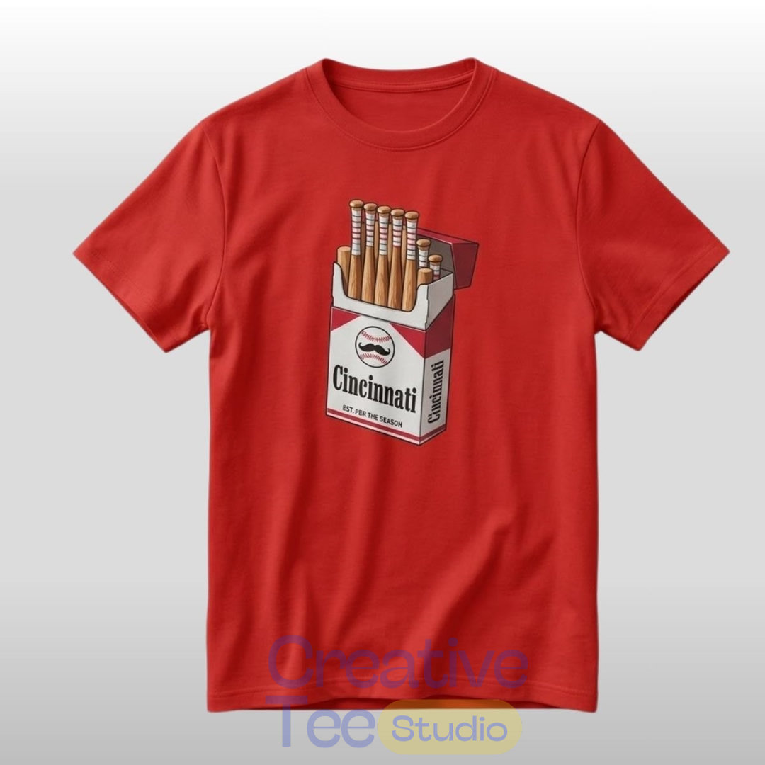 This bold red tee features a clever graphic of an open cigarette pack — except instead of smokes, it’s packed with baseball bats. The pack reads “Cincinnati” with the classic Reds logo, making it a fun, subtle nod to the city’s baseball obsession.