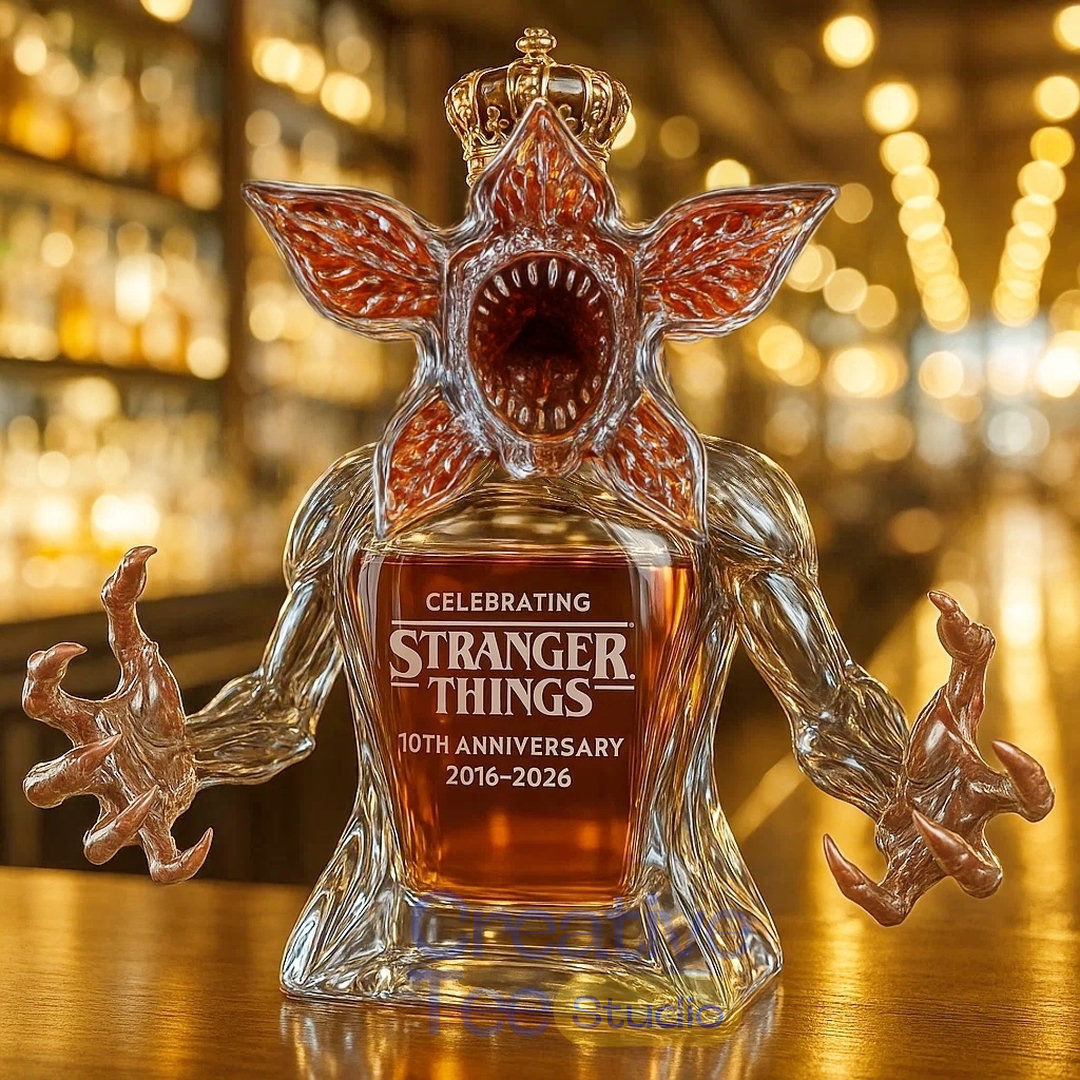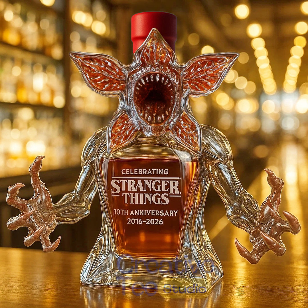 The Demogorgon Celebrating Stranger Things 10th Anniversary Whiskey Bottle is a stunning collector’s piece that captures the terrifying essence of the iconic monster from the hit Netflix series. Released to commemorate the Stranger Things 10th Anniversary in 2026—marking a decade since the show’s premiere on July 15, 2016—this handcrafted decanter transforms the fearsome Demogorgon into an elegant yet eerie vessel for premium spirits. Crafted from high-quality crystal-clear glass, the bottle features intricate sculpting that brings the creature’s otherworldly form to life, complete with petal-like jaws, elongated limbs, and a crowned top for added dramatic flair. Ideal for fans and whiskey enthusiasts alike, this limited-edition item serves as both functional barware and a bold display of fandom. The amber liquid inside evokes the mysterious glow of the Upside Down, making every pour a nod to the series’ supernatural thrills. Whether displayed on a shelf or used to serve guests, the Demogorgon Celebrating Stranger Things 10th Anniversary Whiskey Bottle stands as a testament to the enduring popularity of Stranger Things.