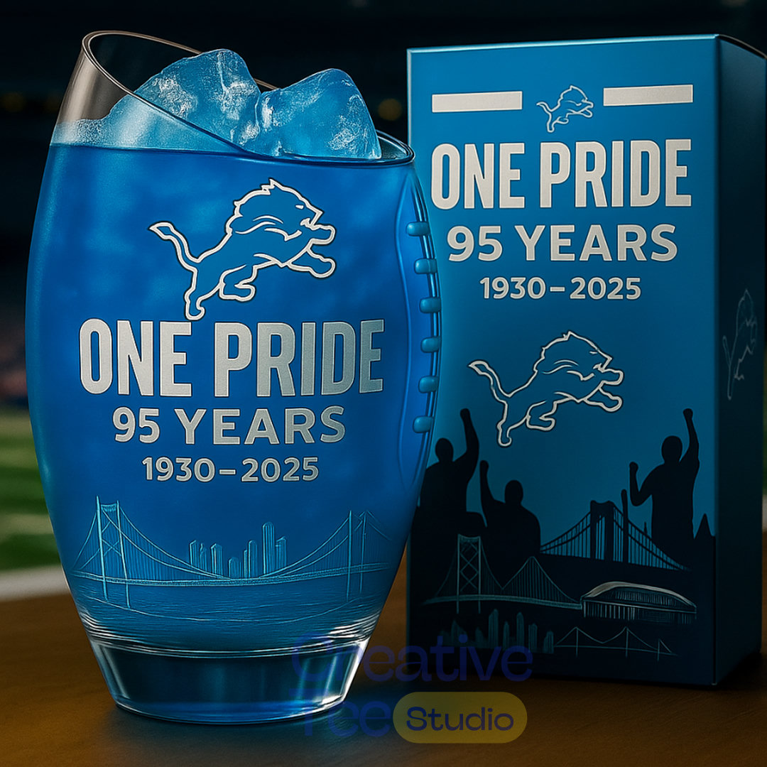 Celebrate 95 years of Detroit Lions pride with this striking Detroit Lions 95th ANNIVERSARY Whiskey Glass! This premium, etched rocks glass boasts a bold blue design with the iconic leaping Lions logo prominently featured, alongside the powerful “ONE PRIDE” mantra and “95 YEARS 1930-2025” tribute.