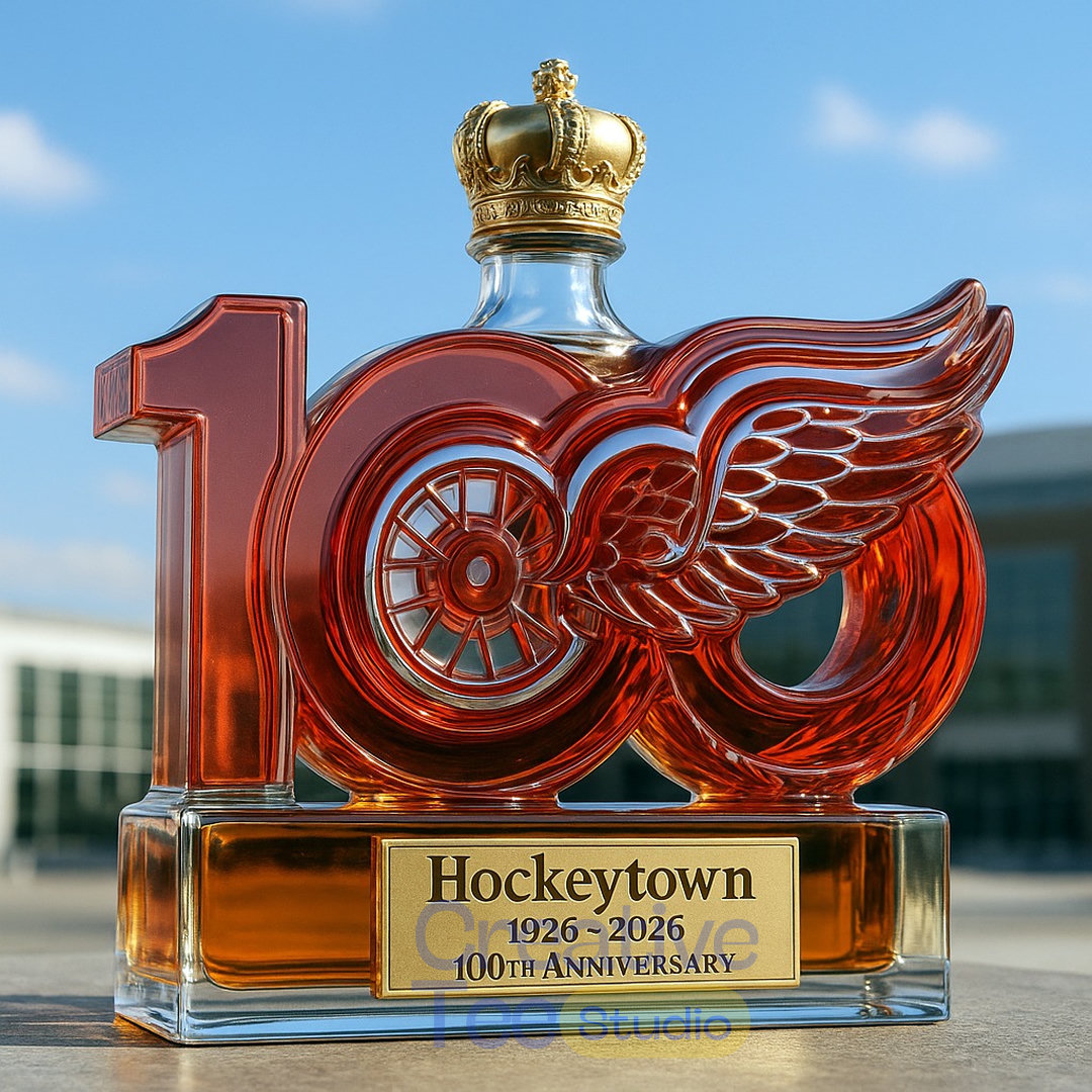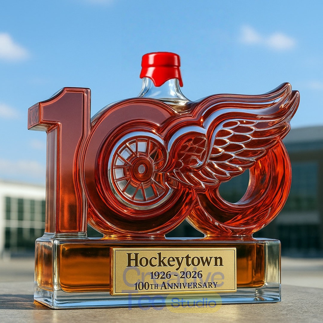 Since 1926, the Detroit Red Wings have defined grit, skill, and championship culture. As we approach the historic 100th Anniversary, there is no better way to honor the “Production Line“, the “Russian Five“, and every legend in between than with this breathtaking commemorative whiskey bottle. This isn’t just a container; it is a glass-blown monument to Hockeytown.