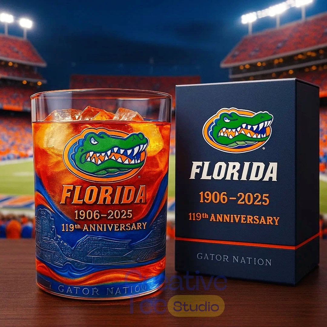The Florida Gators 119th Anniversary Whiskey Glass is a premium, etched collectible tribute to the University of Florida’s proud legacy, celebrating 119 years of academic excellence, athletic dominance, and unbreakable Gator Nation spirit from 1906 to 2025.