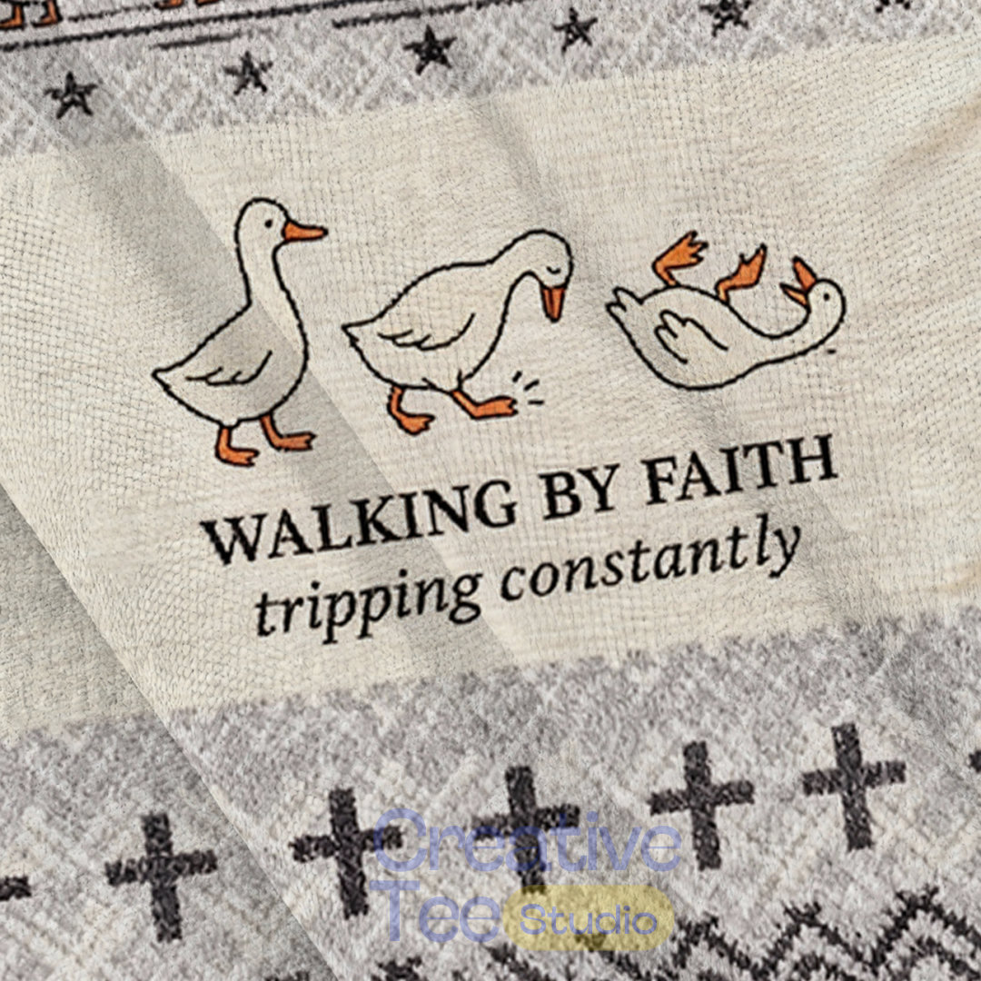 Embrace the chaos of faith with this hilarious Funny Goose Walking By Faith Ugly Christmas Sweater! Featuring clumsy geese tripping over their own feet amid festive patterns, crosses, stars, and the bold mantra “WALKING BY FAITH… tripping constantly”, this cozy, all-over print crewneck captures the perfect blend of Christian humor and holiday spirit. Ideal for church gatherings, family photos, or spreading smiles during the season—because even when life (or your walk) gets wobbly, grace keeps you going. Soft, warm, and delightfully ugly—your new favorite Christmas conversation starter! 🪿✝️🎄