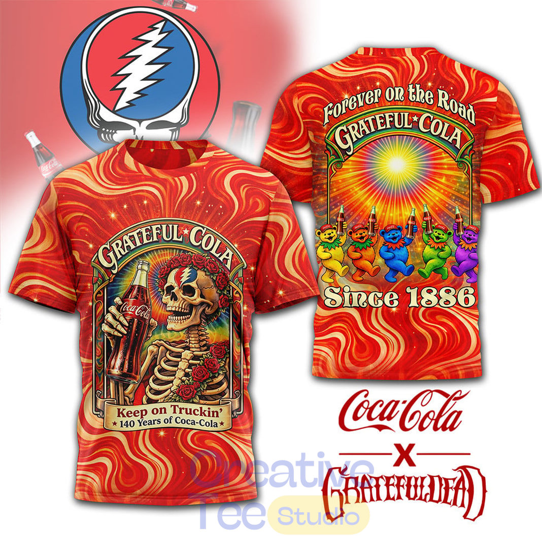 This eye-catching red T-shirt features a swirling, tie-dye-inspired background in fiery orange and red tones. The front displays “GRATEFUL-COLA” in bold retro lettering above a detailed skeleton graphic holding a classic glass Coca-Cola bottle. Below, the phrase “Keep on Truckin’ (with a little help from Coca-Cola)” adds a playful nod to Grateful Dead lore.
