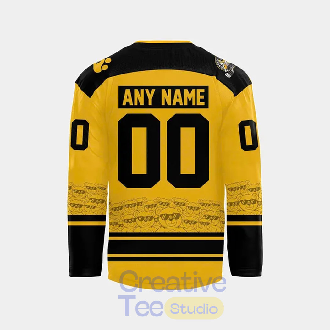 This 2026 edition captures that joyful energy in a bold, eye-catching design. The jersey features a vibrant gold (yellow) base, evoking the team’s classic colors, accented by sharp black shoulders, sleeves, and stripes for a dynamic, high-contrast look. Dominating the chest is the standout Teddy Bear crest: an adorable yet fierce cartoon teddy bear mascot, likely sporting Gamblers gear or a hockey stick, encircled or integrated with team branding for that special event flair. Black cuffs and collar add clean finishing touches, while subtle black horizontal stripes and custom autograph-style graphics (like player signatures scattered across the body) give it a game-worn, limited-edition vibe. The back proudly displays any personalized name and number (e.g., “ANY NAME” and “00” as shown), making it perfect for die-hard supporters.