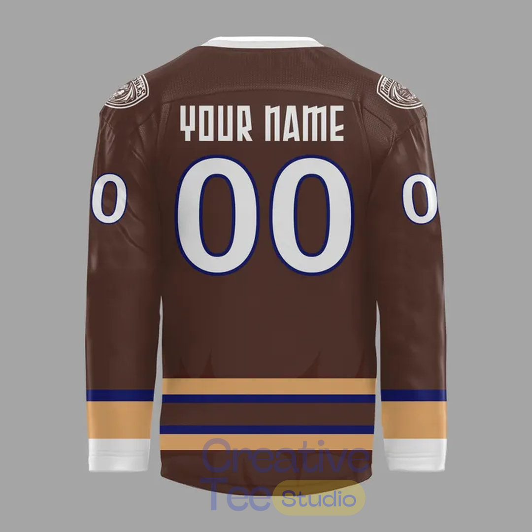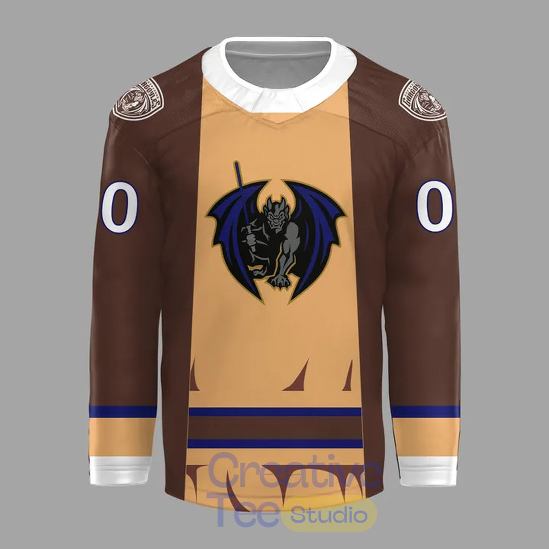 Dominating the design is a striking tan/sand base inspired by Tatooine dunes, accented by rich midnight blue piping and bold brown shoulders that evoke rugged Mandalorian armor. The front features the iconic Gargoyles logo—a menacing gargoyle guardian reimagined as a dark-side warrior with glowing eyes, bat-like wings, and subtle Star Wars-inspired details like a lightsaber hilt integrated into the claws. Vibrant blue trim lines the collar, cuffs, and hem, while dynamic blue stripes slash across the sleeves for high-speed motion appeal. The back offers full personalization: showcase YOUR NAME above your custom number (00 as standard, or any you choose) in classic hockey block font with blue and brown outlines—ready to rep your fandom on the ice or in the stands.