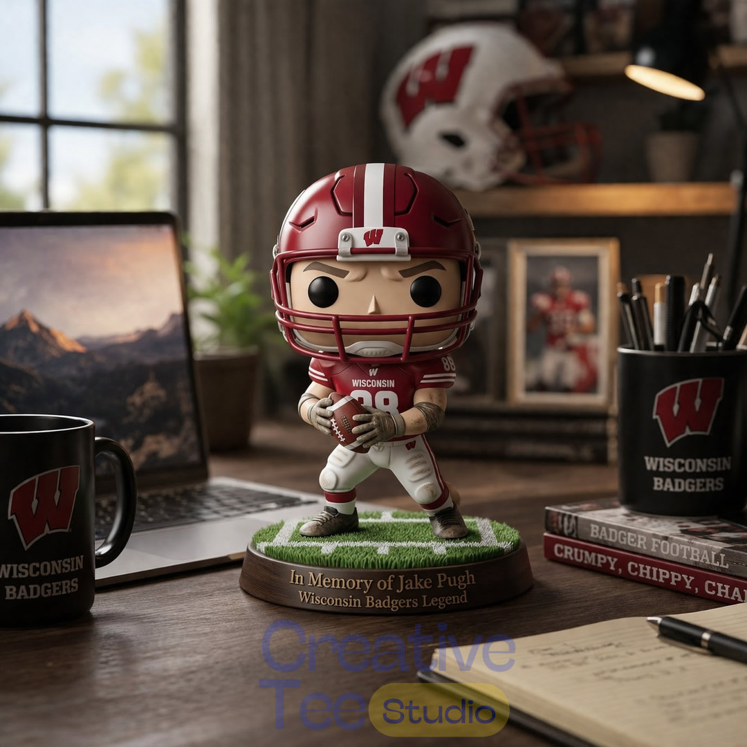 Dressed in his iconic red Wisconsin helmet and uniform, the figure shows Jake in action pose holding the football on a custom green field base inscribed: “In Memory of Jake Pugh – Wisconsin Badgers Legend”