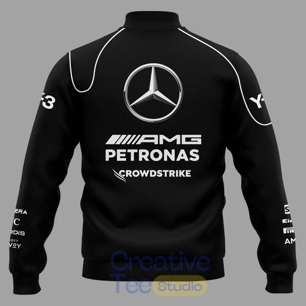 Every detail has been curated to represent the legacy of Mercedes-AMG. The front is dominated by bold “MERCEDES” lettering across the chest, complemented by an array of authentic sponsor logos including INEOS, Petronas, and UBS. The iconic Mercedes-Benz three-pointed star takes center stage on the back, framed by the AMG Petronas Formula One Team wordmark and CrowdStrike branding.
