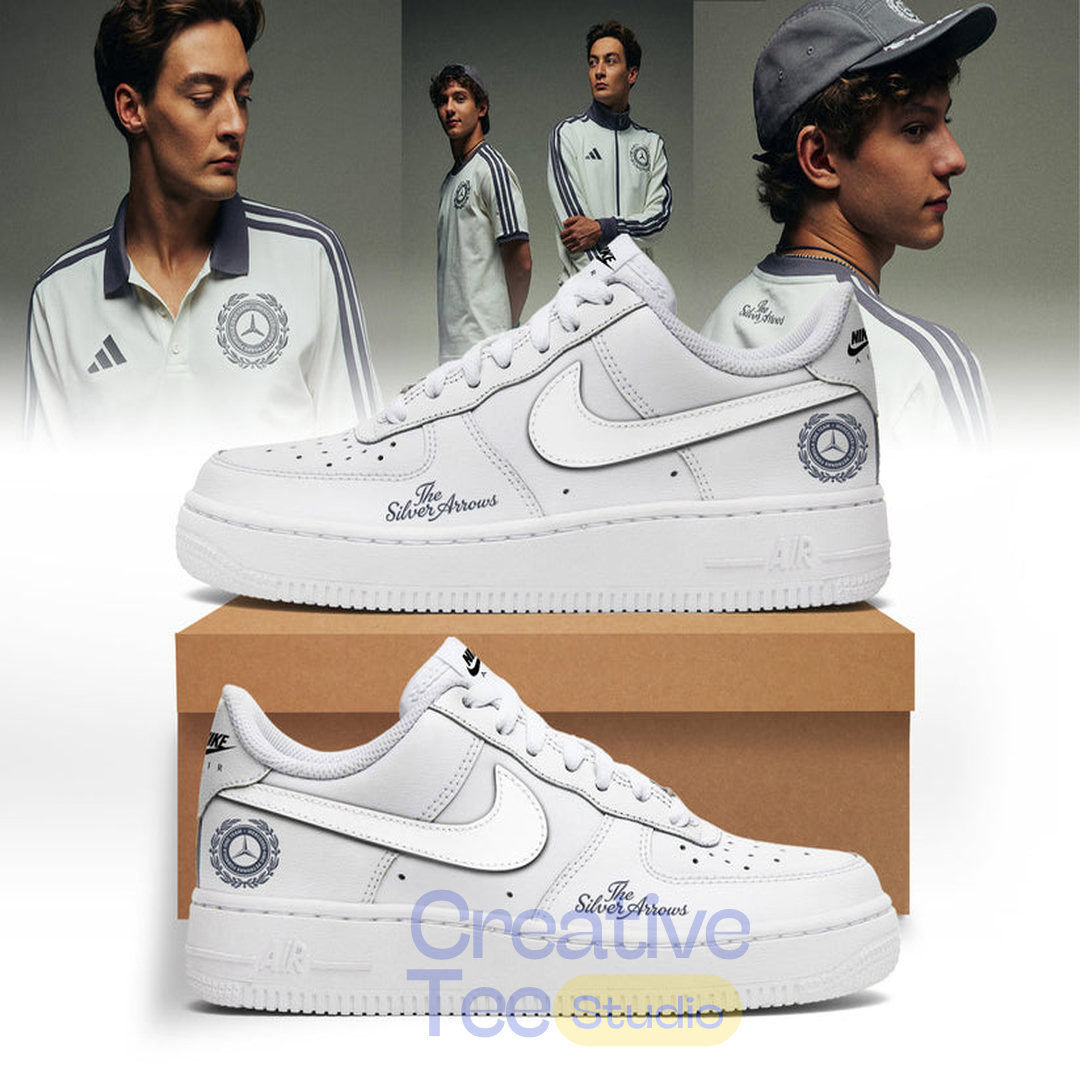 The Mercedes-AMG PETRONAS F1 2026 “The Silver Arrows” Special Edition AF1 is a premium custom sneaker that fuses the timeless icon of the Air Force 1 with the legendary heritage of the Silver Arrows.