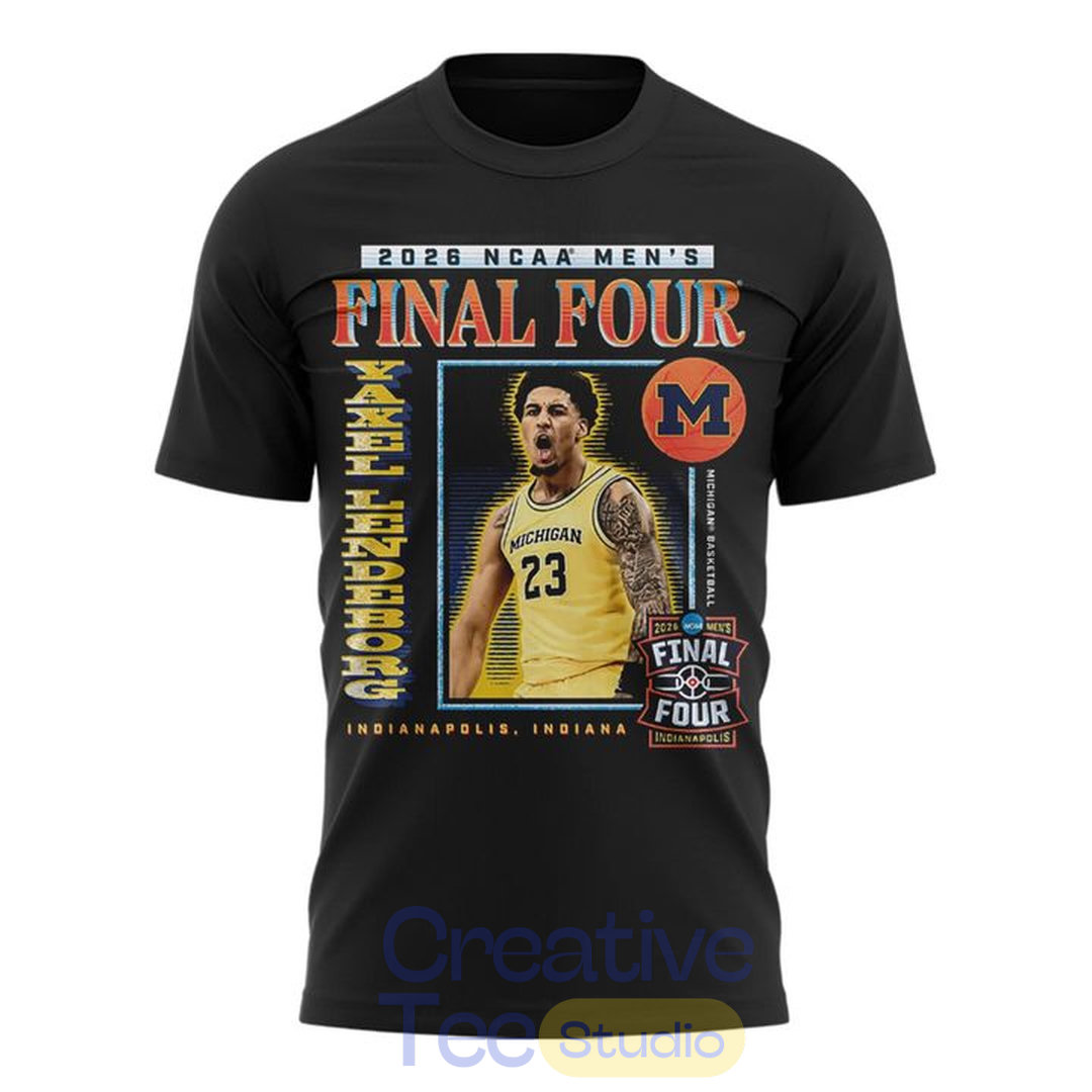 The Michigan Wolverines Men’s Basketball Campus Ink Yaxel Lendeborg Final Four T-Shirt is a bold black commemorative tee celebrating Michigan basketball’s thrilling run to the 2026 Final Four and standout forward Yaxel Lendeborg.