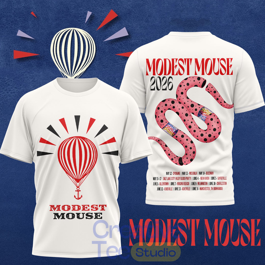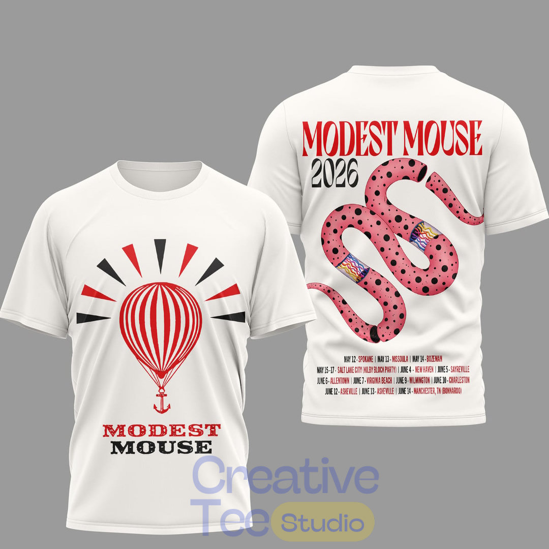 This Modest Mouse 2026 Tour T-Shirt features a bold front design with a red-and-white striped hot air balloon anchored by the band’s name in classic lettering, surrounded by dynamic red and black rays.