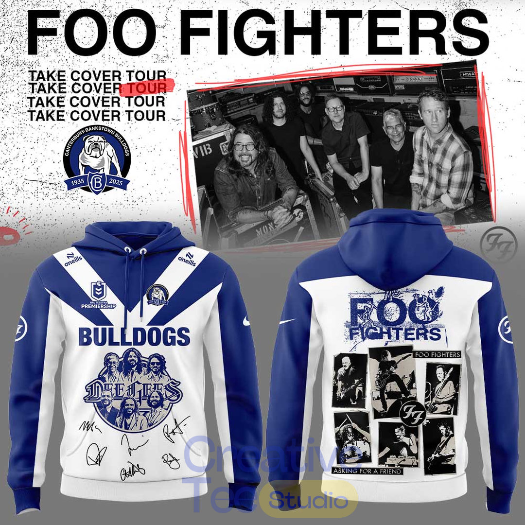 This premium hoodie collection fuses Foo Fighters’ raw energy with your favorite NRL club’s identity. Each team-specific design features the iconic Foo Fighters logo across the chest, a collage of live band photos, and the official “Take Cover Tour 2026” branding. The back proudly displays your team’s name and crest (Broncos, Bulldogs, Storm, Roosters, etc.) alongside a full-color Foo Fighters group shot and the band’s authentic signatures.