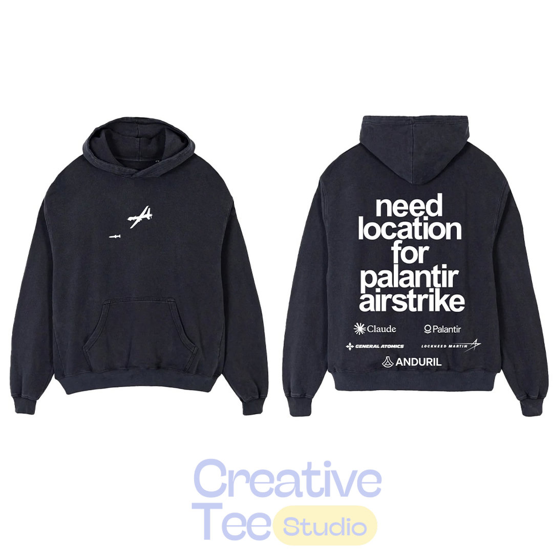 This premium black heavyweight hoodie features a clean, minimalist front design with a sleek white fighter jet graphic soaring across the chest, paired with subtle “AIRSTRIKE” text below. Flip it around and the back delivers the punchline: “need location for palantir airstrike” in large, commanding white lettering, followed by a lineup of cutting-edge AI and tech logos including Claude, Grok, xAI, Anduril, and Palantir.