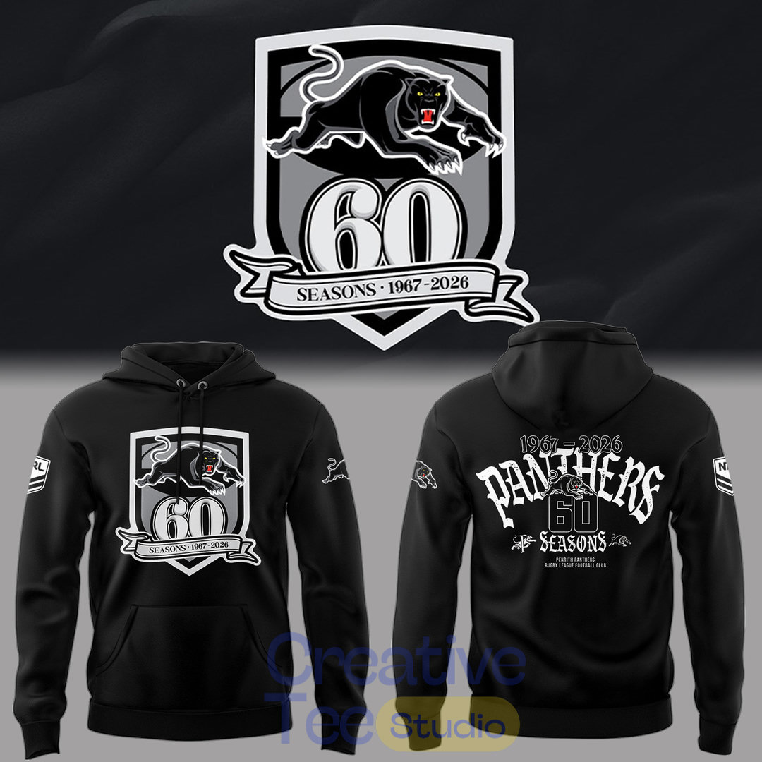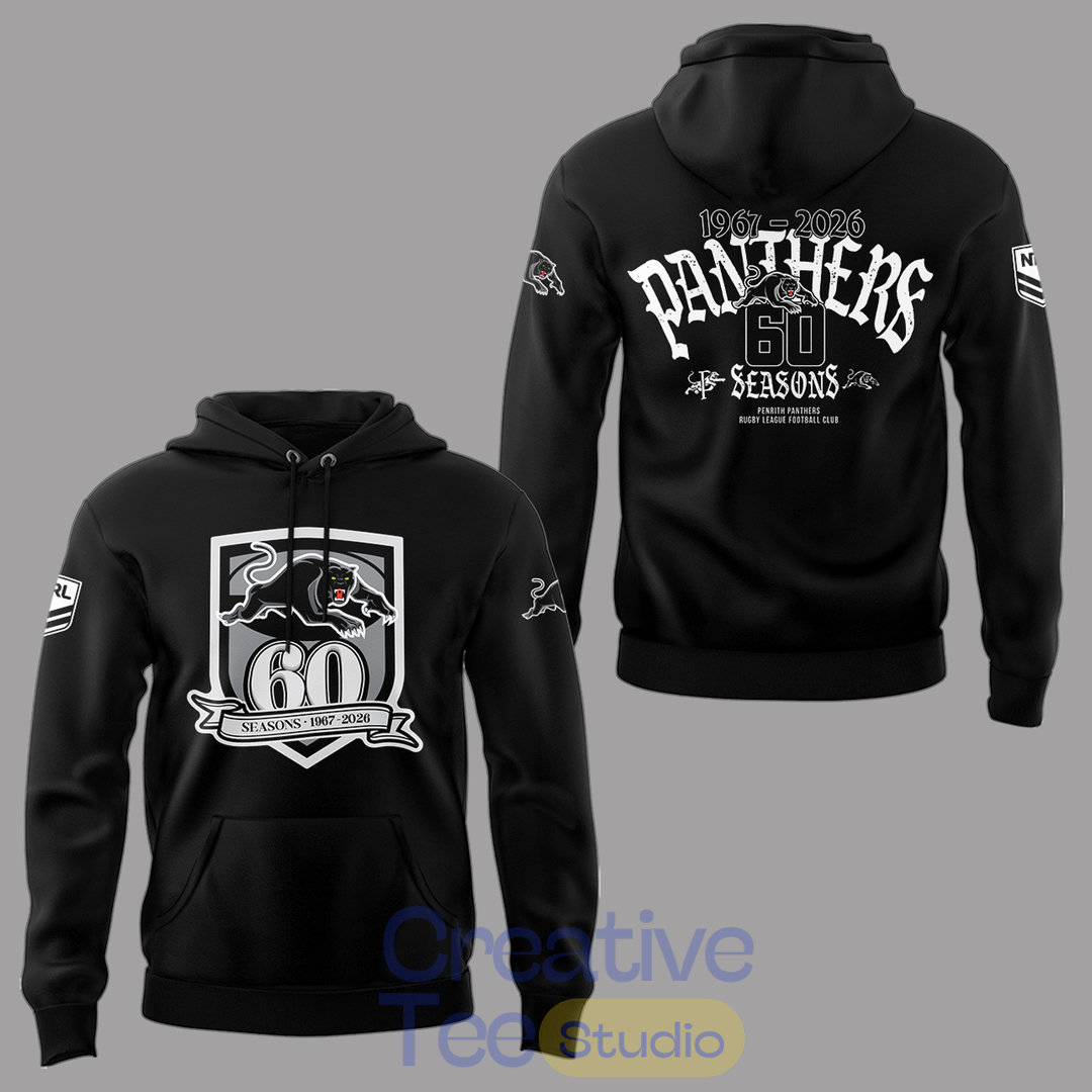 This sleek black hoodie features a bold front crest with the iconic Panthers logo and “60 Seasons 1967–2026” banner. The back proudly displays “PENRITH PANTHERS 60 SEASONS” with the team emblem, making it a standout piece for true fans.