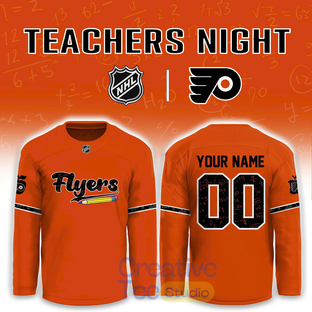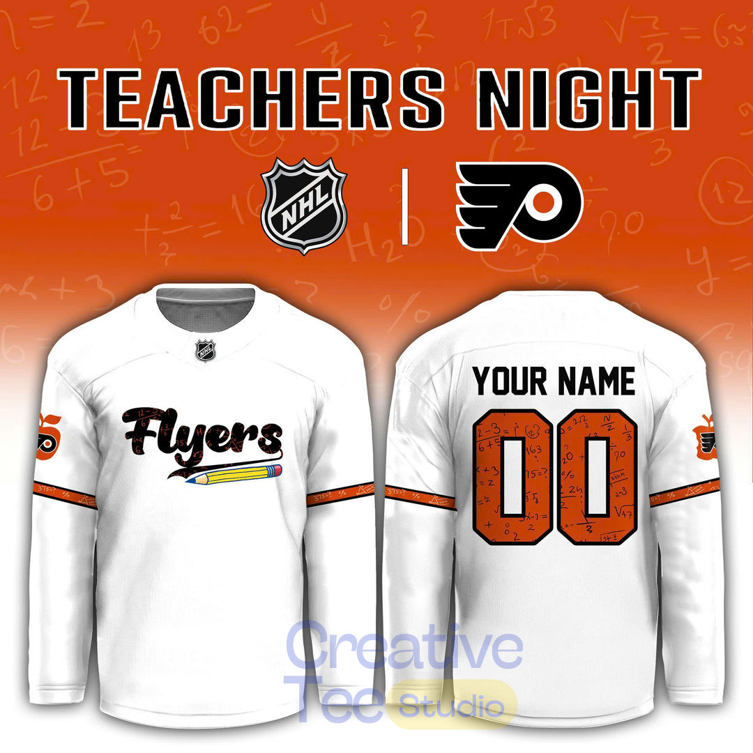 This jersey captures the classic Flyers look with a vibrant orange home base (or crisp white alternate option), featuring bold black and white accents along the sleeves and hem for that authentic Broad Street Bullies vibe. The front proudly displays the legendary Flyers logo alongside subtle “TEACHERS NIGHT” or appreciation-themed detailing, celebrating the dedication of teachers everywhere. The back offers full personalization: add YOUR NAME above your chosen number in durable, high-contrast lettering—perfect for making it your own or gifting to an inspiring educator.