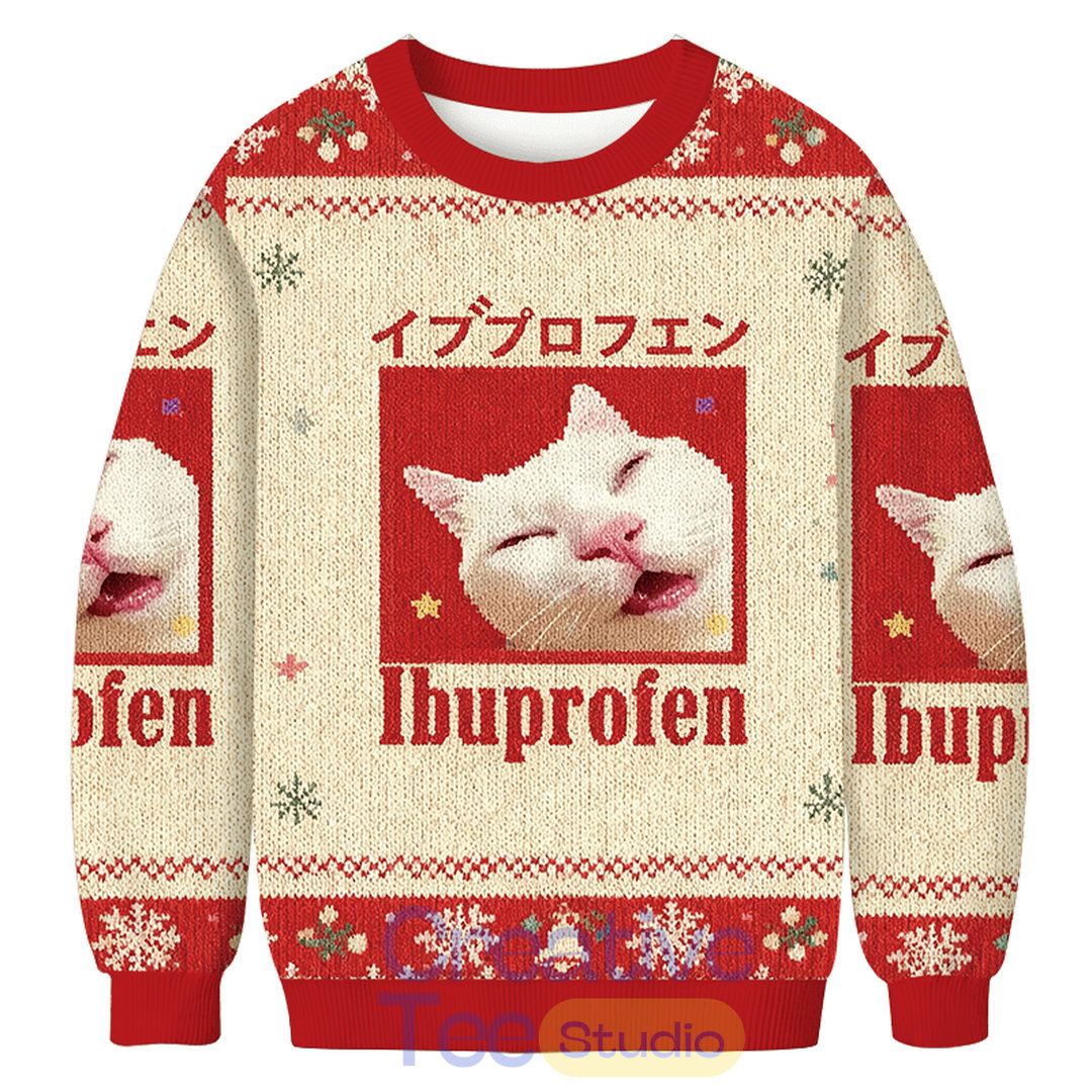 Don’t miss your chance to add a touch of humor to your holiday wardrobe—grab your Red Ibuprofen Meme Cat Christmas Ugly Sweater today and get ready to celebrate in style!