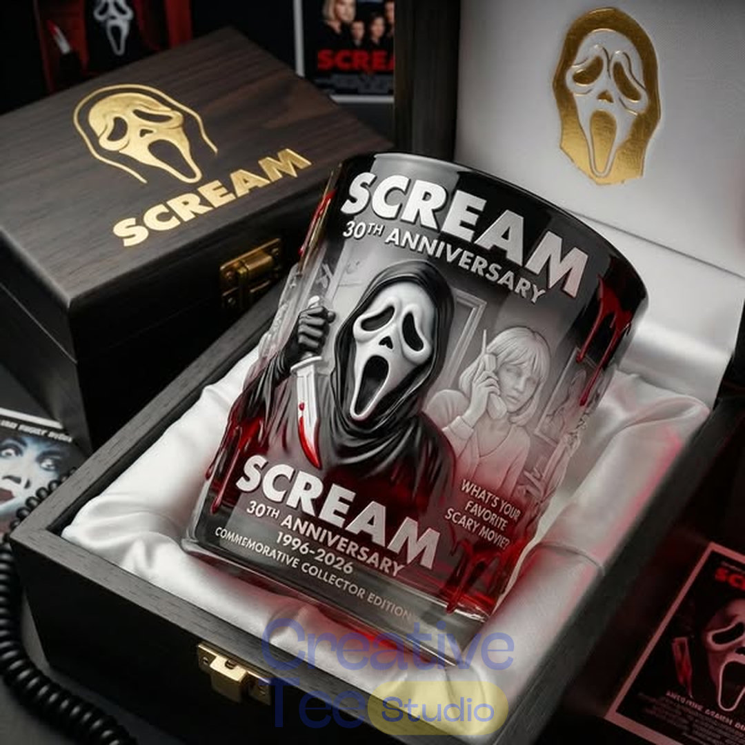 This premium rocks glass features a bold, chilling design with Ghostface front and center, blood-red accents, and iconic imagery from the legendary horror franchise. The glass is printed with “SCREAM 30th ANNIVERSARY 1996–2026” and the tagline “What’s your favorite scary movie?” for the ultimate collector’s touch.