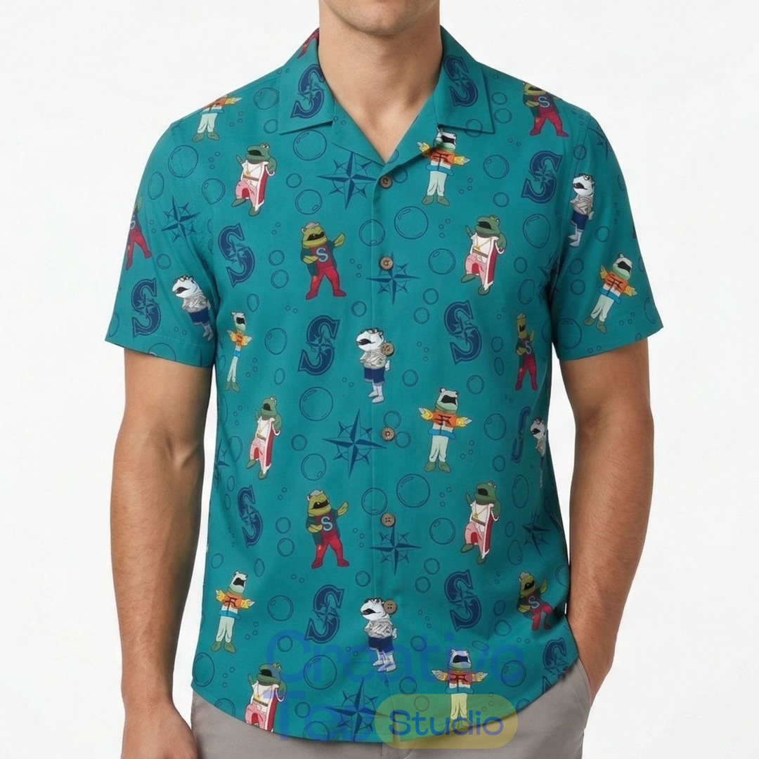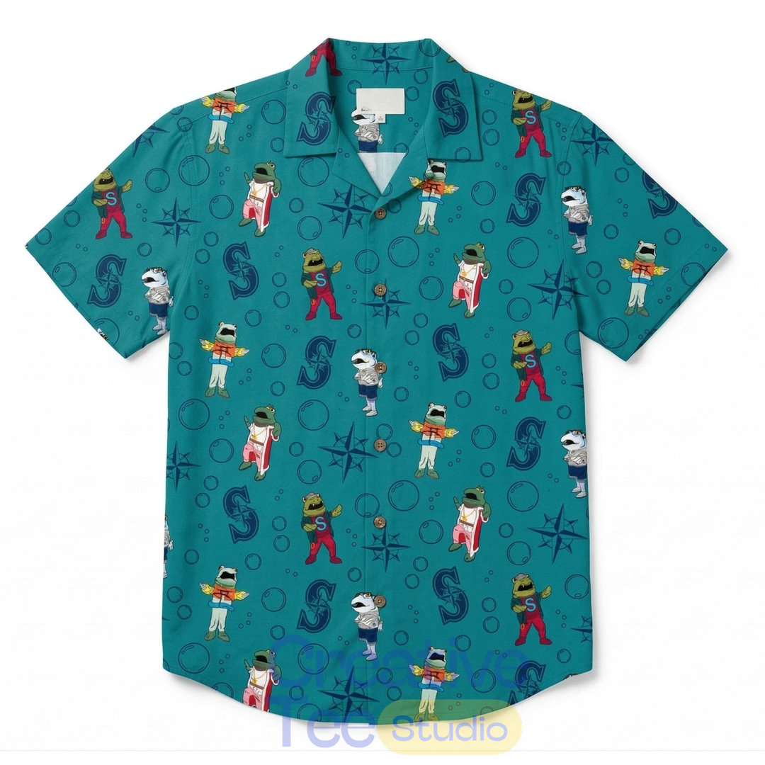 This vibrant teal button-up is packed with playful Mariners-themed graphics — cartoon salmon wearing team caps and jerseys, dollar signs, and compass roses — capturing the fun spirit of a Seattle Salmon Run.