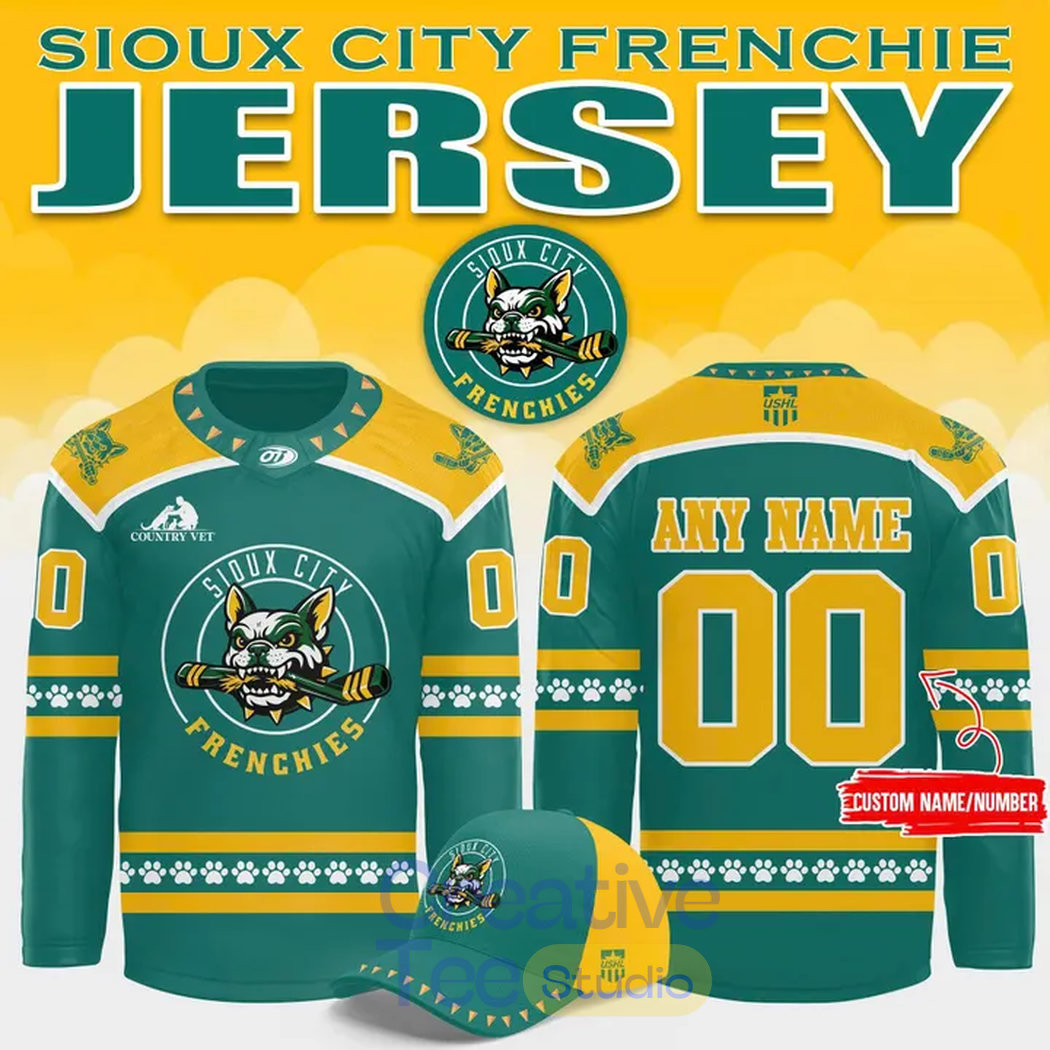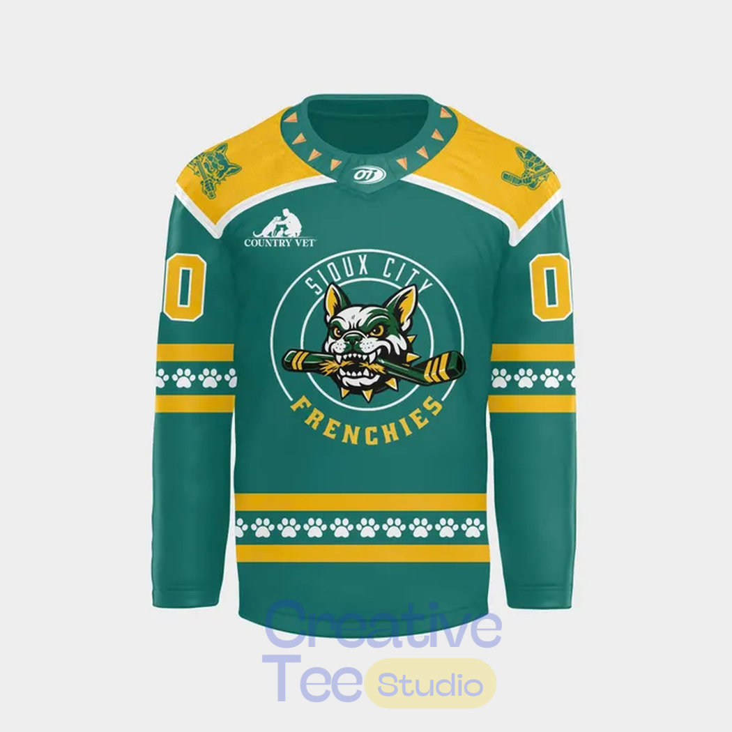 Unleash the “paws-itive” energy of the Tyson Events Center with the Sioux City Frenchies Special Edition Jersey. This 2026 crossover reimagines the Musketeers’ identity with the viral “Frenchie” bulldog mascot. Featuring a bold navy, gold, and white palette with custom personalization options, it’s the ultimate way to show your love for Sioux City hockey and our four-legged fans.