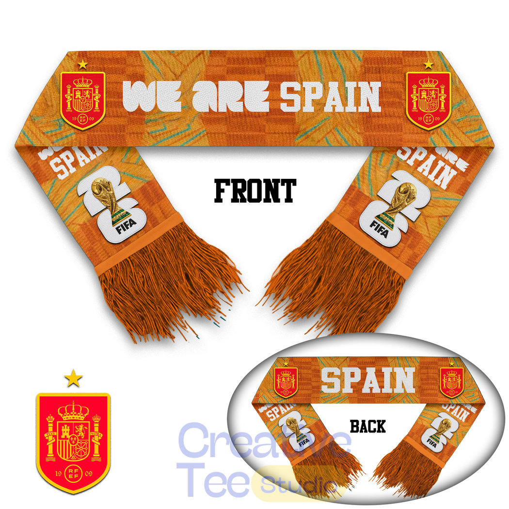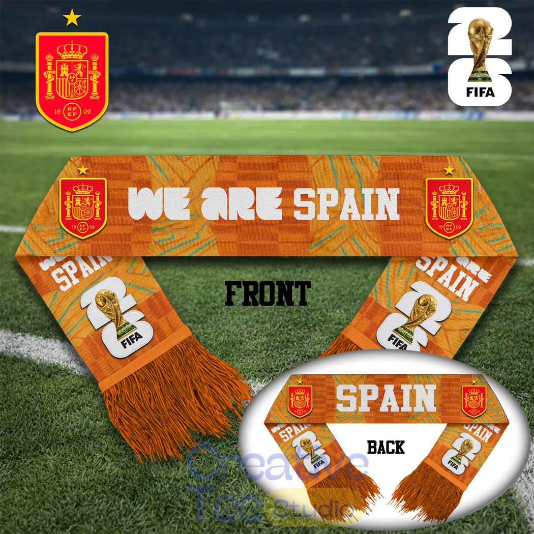 This premium orange scarf features a stylish Spanish flag-inspired pattern and bold “WE ARE SPAIN” lettering across the front, flanked by the RFEF crest. The reverse side displays a clean “SPAIN” graphic with the team emblem and the FIFA World Cup 26 logo.