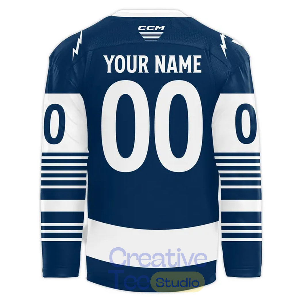 This jersey is as tough as the city it represents. The design utilizes a deep Midnight Navy and Industrial Grey foundation, highlighted by vibrant Solar Blue piping that glows under the arena lights. Whether you’re standing in the supporters’ section or heading out in the 315, this jersey provides a professional, “on-ice” look that demands respect.