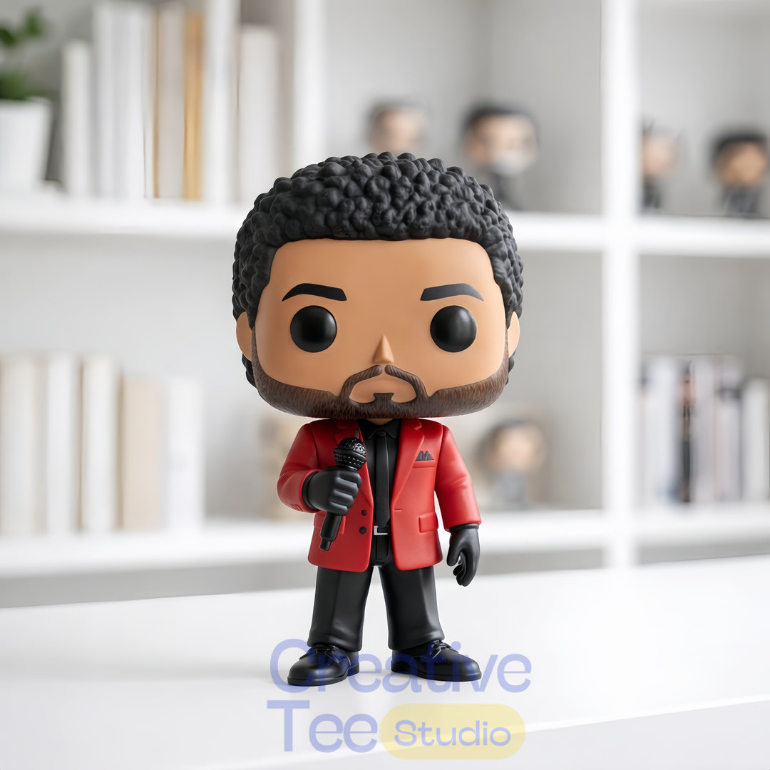 This sleek Pop! Figure captures Abel Tesfaye in his iconic red blazer, black pants, and signature curly hair, holding a microphone — straight from the dark, cinematic world of After Hours.