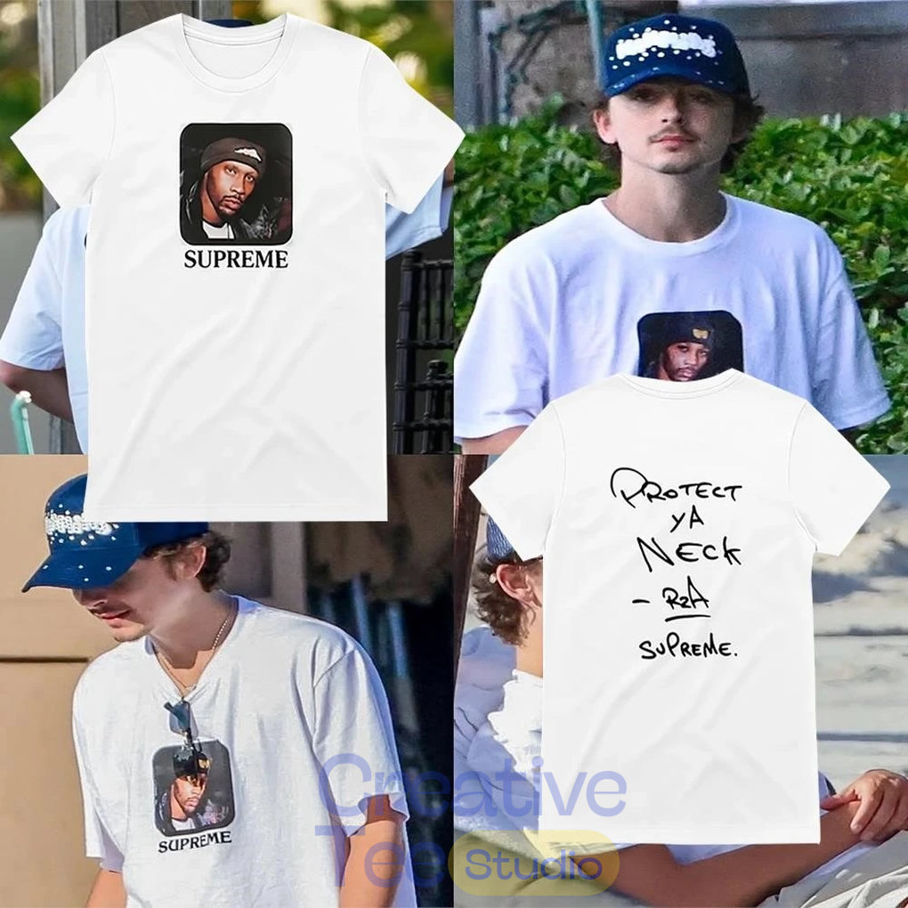 Available in various sizes, this t-shirt caters to a wide audience, ensuring everyone can enjoy this stylish blend of culture and comfort. Whether you’re dressing it up with a stylish jacket or keeping it casual with jeans, the versatility of the Timothée Chalamet Supreme Wu-Tang Protect Ya Neck RZA T-Shirt makes it a staple in any wardrobe.
