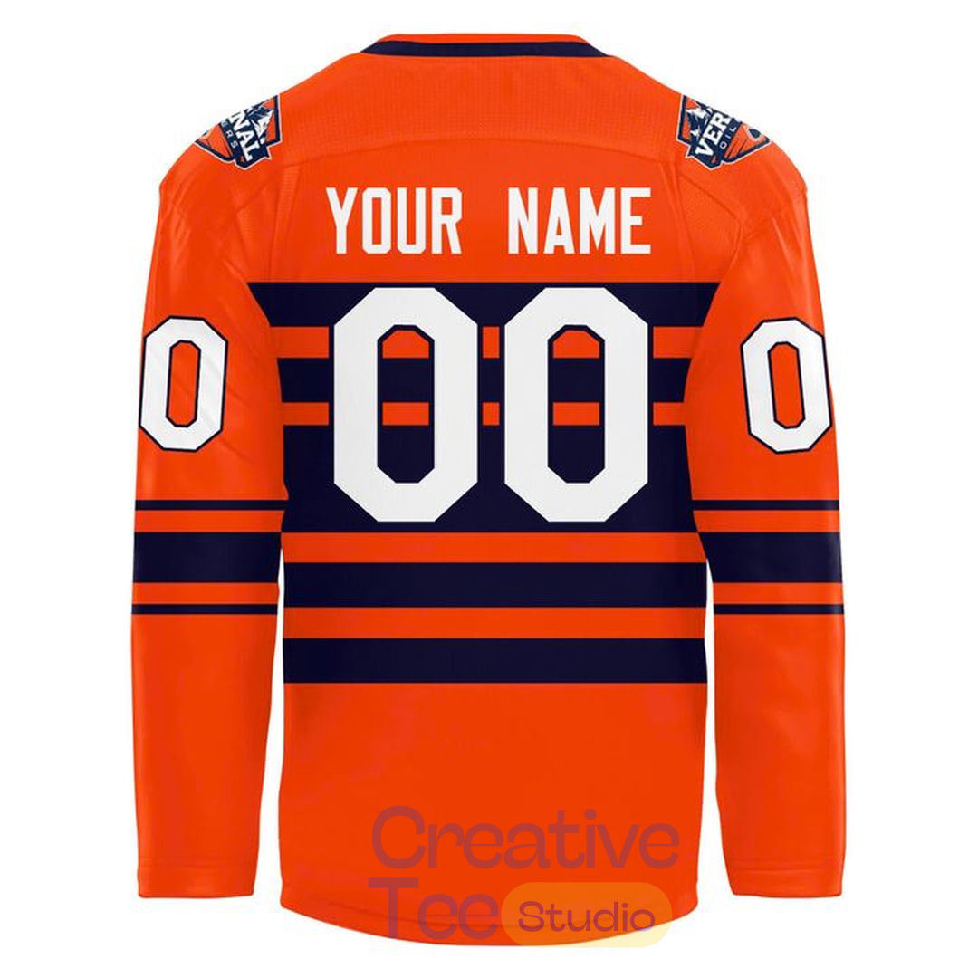This eye-catching custom jersey rocks a vibrant burnt orange base — the signature color that echoes the rugged desert sunsets and the Oilers’ fiery competitive drive. Classic navy blue accents deliver sharp contrast: thick horizontal stripes wrap the arms and body in classic hockey style, while navy piping outlines the V-neck collar, cuffs, and hem for that authentic, timeless look. The front explodes with a large, arched “VERNAL” wordmark in bold navy lettering across the chest, flanked by custom shoulder patches featuring the Oilers’ roaring oil derrick logo encircled by a hockey stick and puck — a perfect nod to the region’s energy heritage and on-ice intensity.