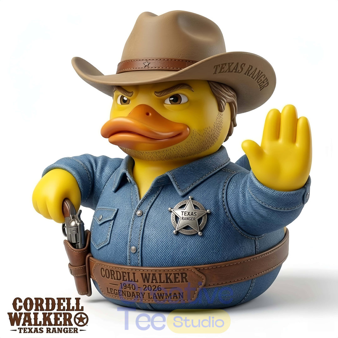 Dressed in full law-enforcement gear, the duck wears a classic tan cowboy hat embroidered with “TEXAS RANGER”, a blue button-down shirt, and a brown leather duty belt featuring a shiny silver Texas Ranger star badge. Bold lettering across the belt reads “CORDELL WALKER – LEGENDARY LAWMAN.” One yellow wing holds a detailed revolver while the other is raised in Chuck Norris’ iconic “halt right there” pose — instantly recognizable to fans of the long-running 1990s action series.